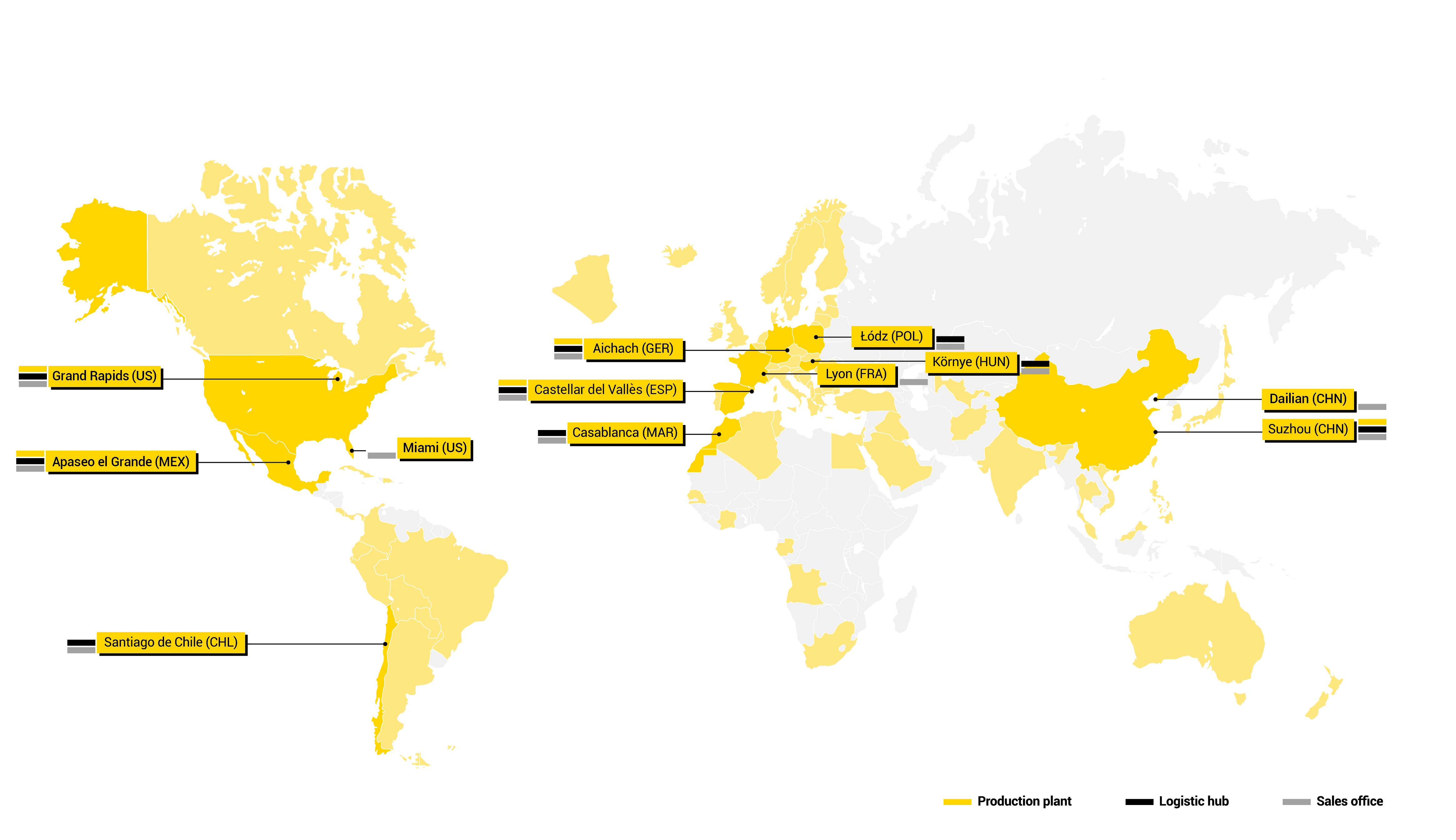 Nous disposons d'unités de production en Espagne, Allemagne, Chine, Mexique et États-Unis d'Amérique. 10 plateformes logistiques réparties sur 4 continents nous permettent d'être au plus près de nos clients et de pouvoir leur proposer un service rapide et fiable malgré une demande changeante.