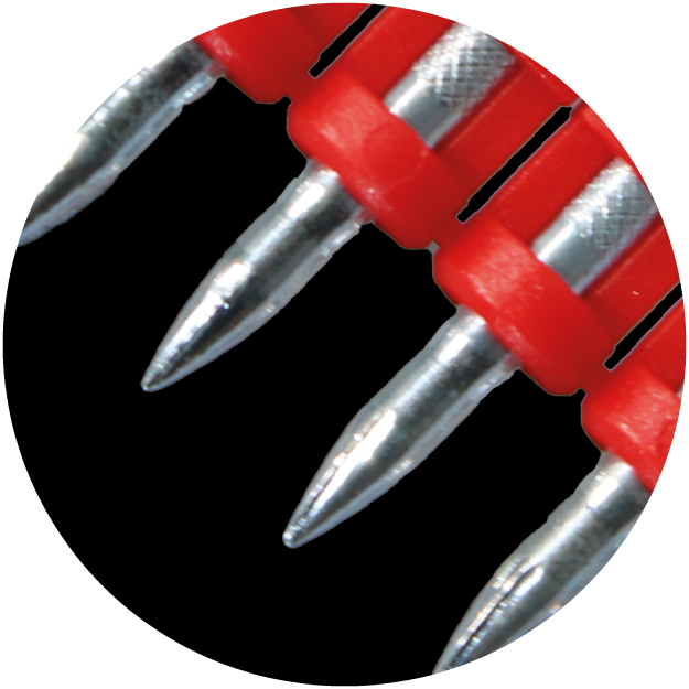 La pointe en forme de balle améliore la pénétration dans le matériau support et facilite le clouage sur des matériaux supports durs.