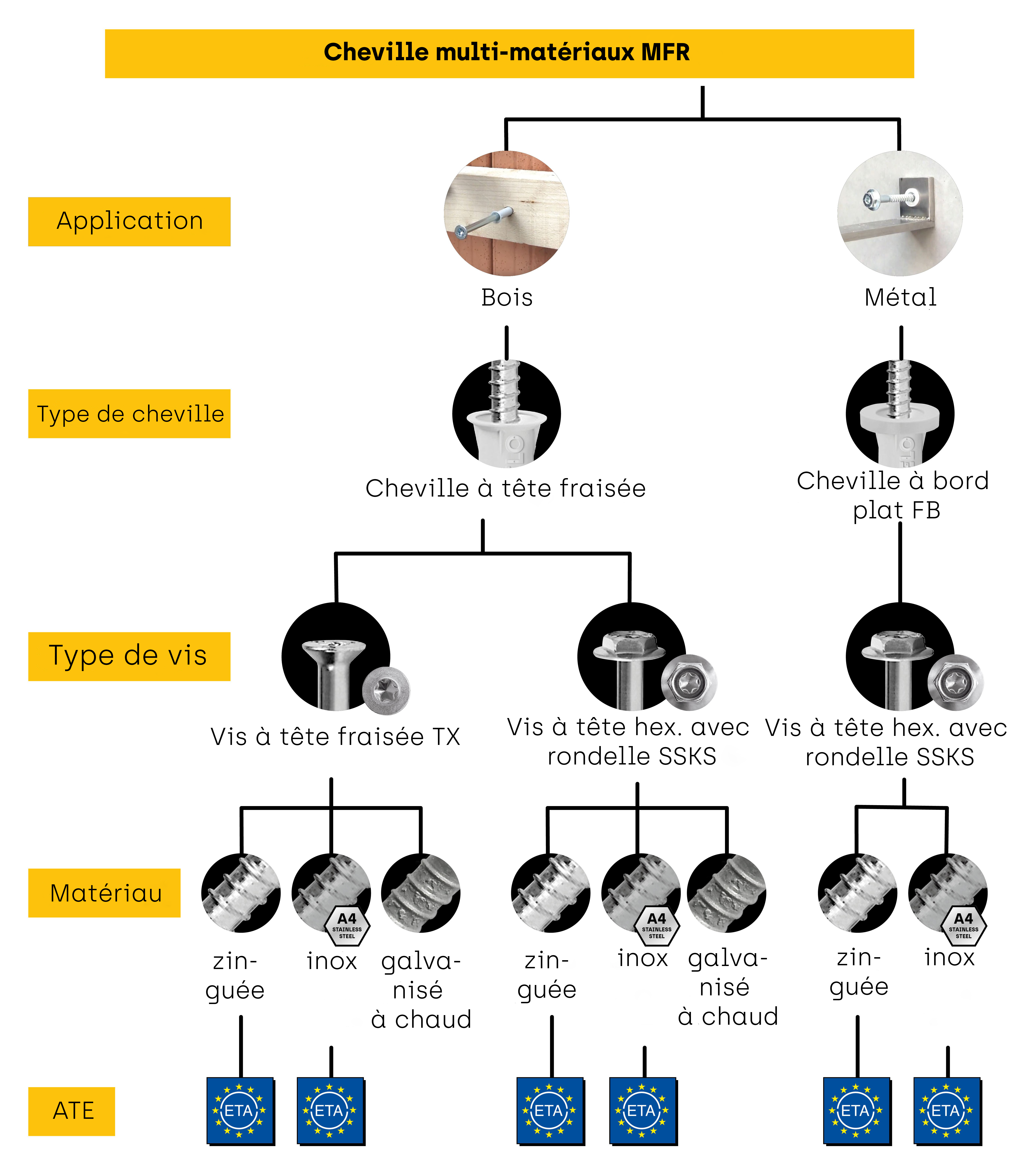 Les chevilles pour ossatures, également appelées chevilles de façade ou chevilles à longue tige, sont des fixations d'ossature principalement utilisées pour la fixation en extérieur, par exemple dans les immeubles de grande hauteur, et assurent un maintien sûr lors de la fixation de façades ventilées et de sous-structures de façade en bois ou en métal. Les domaines d'application des ancres pour cadres sont très variés.